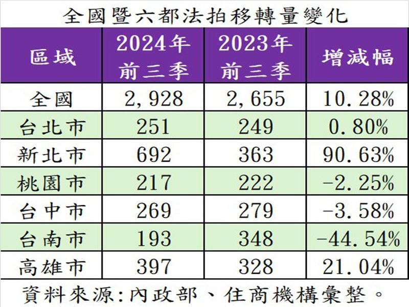 被視為「房市反指標」的拍賣移轉量,近期出現攀升,住商機構彙整內政部數據,全國今年前三季拍賣移轉棟數達2,928棟,比去年同期成長約一成,其中新北市區域法拍量更大漲達九成,大家房屋企劃研究室公關主任賴志昶分析,前三季法拍量出現增長,雖仍屬歷年來次低,惟央行今年以來相繼推出第六、七波信用管制措施,且皆劍指多戶、投資族群,令部分區域法拍量體出現攀升。