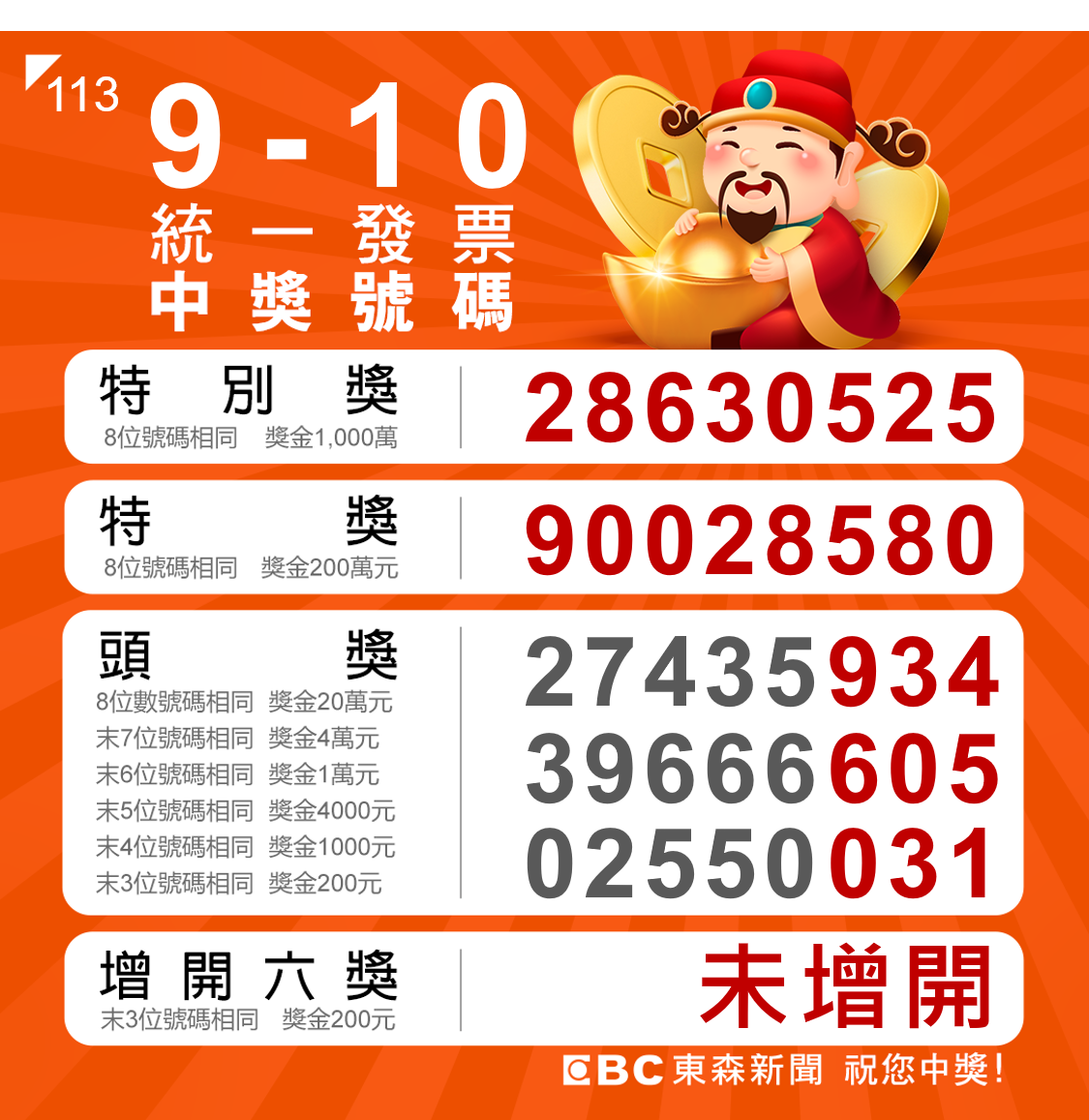根據財政部公告,9-10月統一發票千萬特別獎號碼為28630525,可獲得1000萬,特別獎90028580,可獲得200萬,不過得要以上8位數全都相同,才算是獲獎。排除空白、作廢、金額不符或買受人記載為營業人等不符給獎規定之發票,可兌領特別獎及特獎之中獎發票分別為21張及14張,而領獎期間為今年12月6日至明年3月5日。