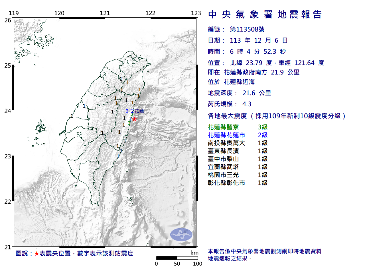 中央氣象署發布顯著有感地震最新消息,今(6)日6時04分,發生芮氏規模4.3有感地震,震央位置在花蓮縣政府南方 21.9 公里 (位於花蓮縣近海),震源深度21.6公里。