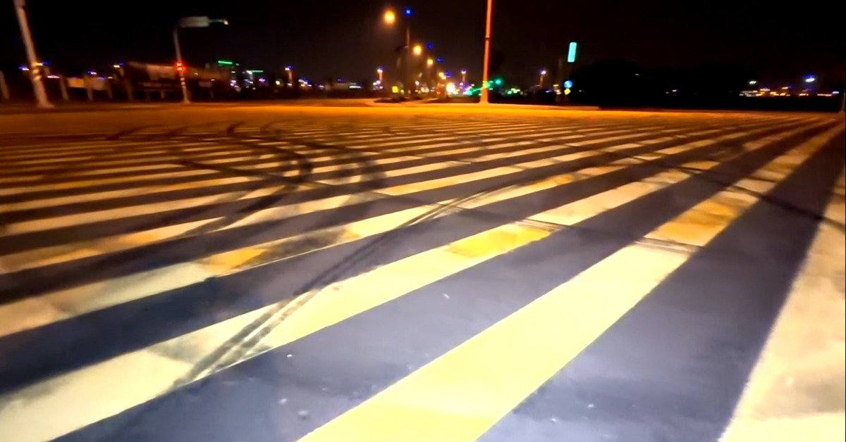 深夜11點多,黑車加速猛踩油門,在槽化線上大玩特技。一圈兩圈來回旋轉燒胎,轉到第4圈衝往旁邊馬路,附近大樓的住戶目睹一切,把槽化線當甩尾場,磨擦發出刺耳聲響,附近住戶都被吵到受不了。