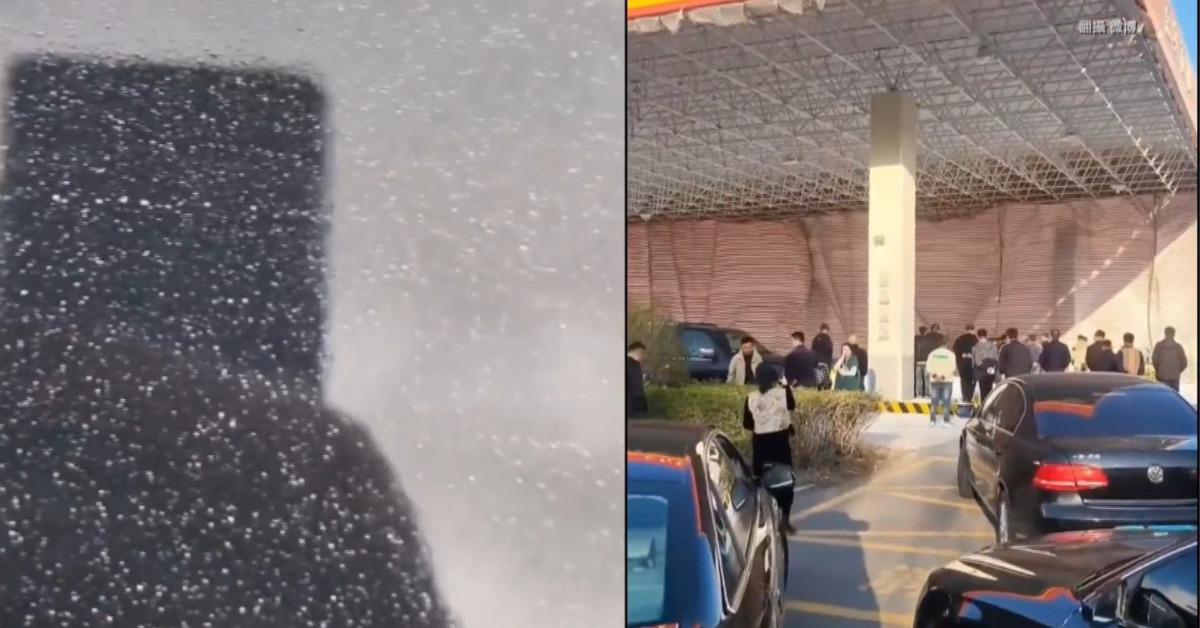 中國吉林一處加油站,頂棚在噴漆時,防護措施疑似沒有做好,起風時,白漆直接飄到後方大型二手車市場,上百輛車沾滿白漆,讓業者氣的上前理論。