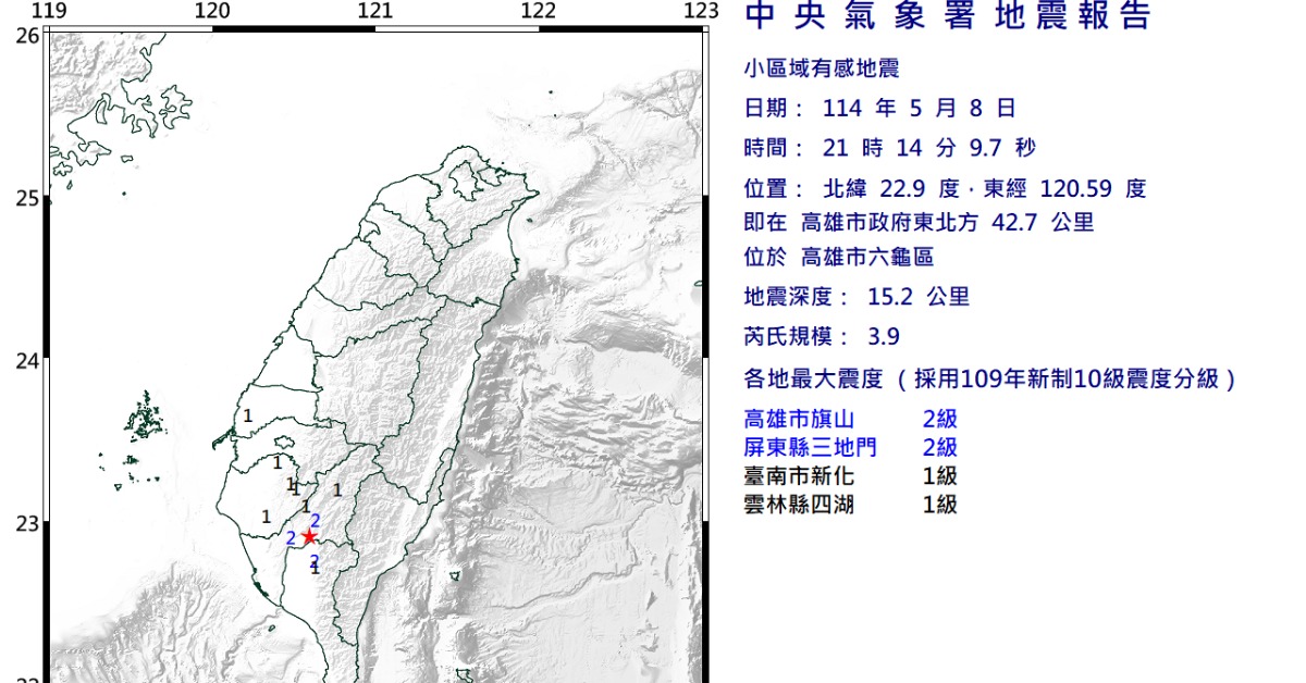 今(8日)21:14左右,發生芮氏規模3.9有感地震,震央位在高雄市政府東北方 42.7 公里高雄市六龜區境內,震源深度15.2公里。各地最大震度,高雄2級、屏東2級、台南1級、雲林1級。
