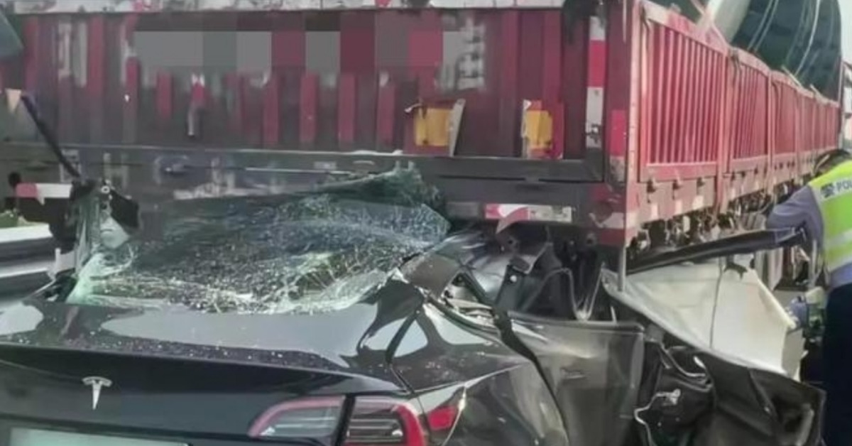 綜合陸媒報導,該輛特斯拉25日下午在湖州市南潯區和孚服務區杭州方向,以飛快速度撞向正在整理安全繩的大貨車,特斯拉A、B柱嚴重變形,駕駛座也幾乎被壓扁,車頭更完全嵌入車斗;大貨車的備胎則被撞飛至少10公尺遠。
