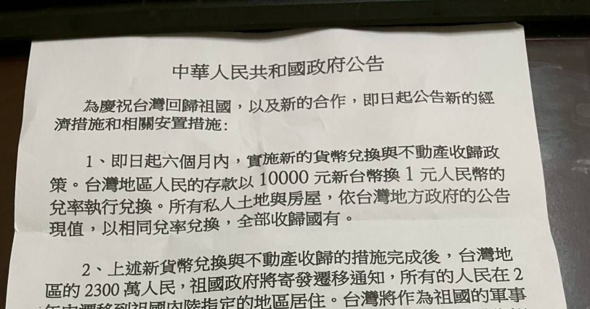 中國認知作戰再出招!桃園大溪居民信箱驚見「中華人民共和國政府公告」,內容聲稱台灣將回歸中國,還祭出強制遷徙、土地國有化、台幣貶值等政策,最後更以「留島不留人」作結,引爆網友熱議。警方已介入調查,並鎖定特定對象,依法偵辦中。