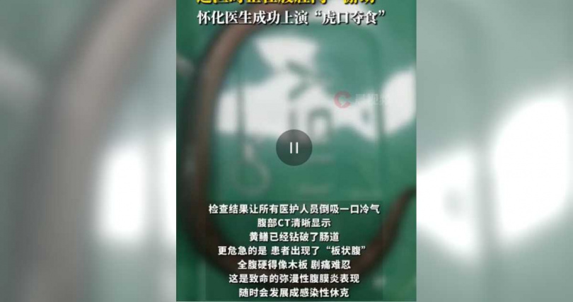 更令人擔憂的是,患者還有「板硬腹」,腹部硬到像木板,也會產生劇痛。醫師用微創腹腔鏡進入腹腔,發現黃鱔在腹腔內蠕動,取出後進行腸壁修復,所幸患者術後恢復良好,順利出院。