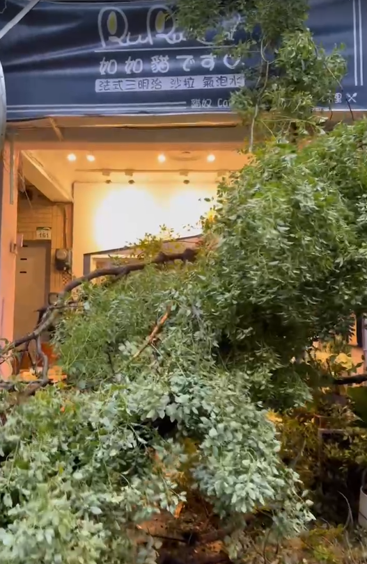 高雄前鎮區滇池街發生大樹倒塌後,橫躺在進騎樓內。
