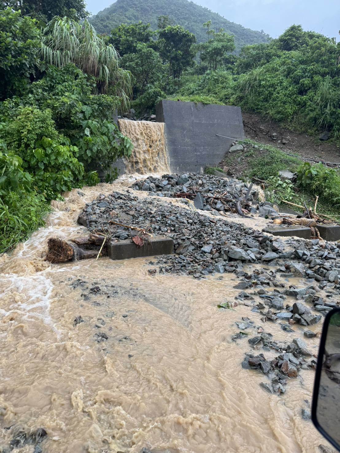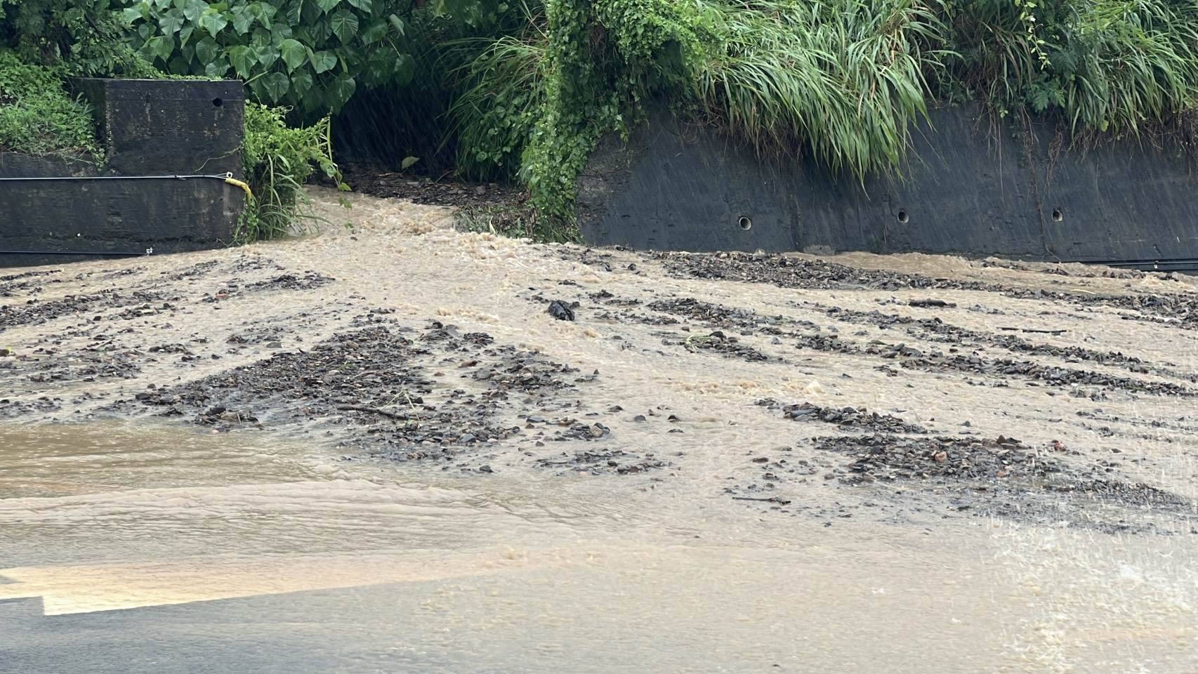 同樣降下大豪雨的台東太麻里,佳崙產業道路已被明顯水流往下方村落,大王村村長已請相關單位送交沙包等物品,來堵住流水。