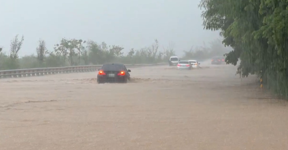 台東縣大武鄉尚武村泥流沖到馬路上,許多車輛涉水經過。(圖/東森新聞)