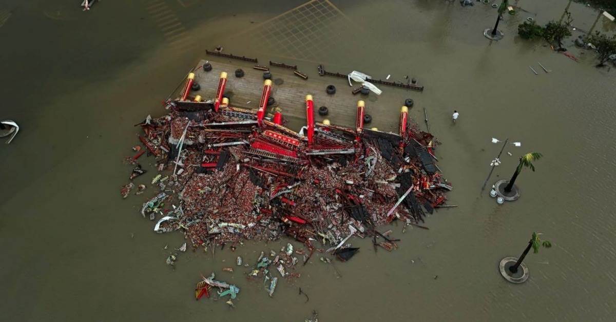南鯤鯓代天府擁有42年歷史的雄偉牌樓,以12根千年紅檜打造,近日卻不敵強風吹襲,整座牌樓倒塌,柱體全數斷裂,瓦片四散泡水,場面相當慘烈。不只如此,台南新營太子宮供奉20年的太子爺神像也遭強風吹倒,竟從底座斷成兩截,讓信眾震驚不已。