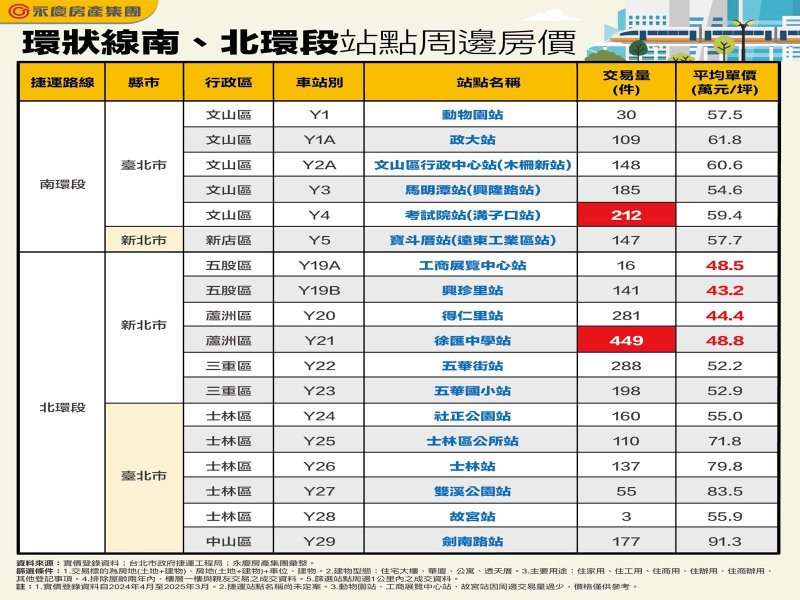 環狀線南、北環段站點周邊房價。(永慶提供)