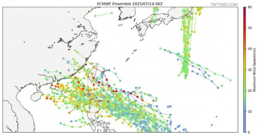粉專強調,雖然系集結果有稍微收斂一點,但建議再等候2、3天態勢會再更明朗一點,目前變數還很大,持續觀察!󠀠「目前較能確定的是週末起到下週,南部、東部雨水偏多。」
