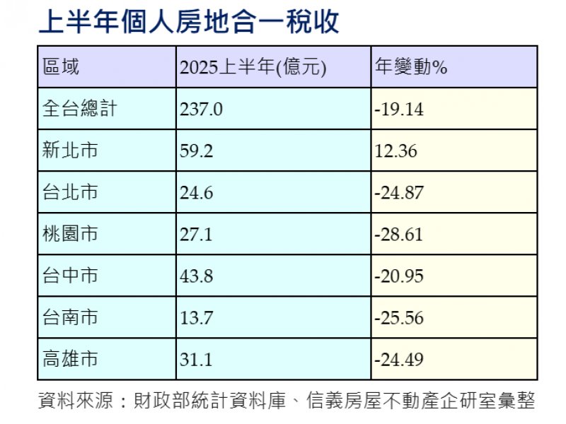 整體而言,全台合計個人房地合一稅收自 2024上半年的293億元,縮減至2025上半年的 237億元,年減約19%,反映近期房市景氣冷靜、交易件數萎縮,主要是房貸政策影響及民眾對於房市預期風向改變,導致買賣意願趨於保守。
