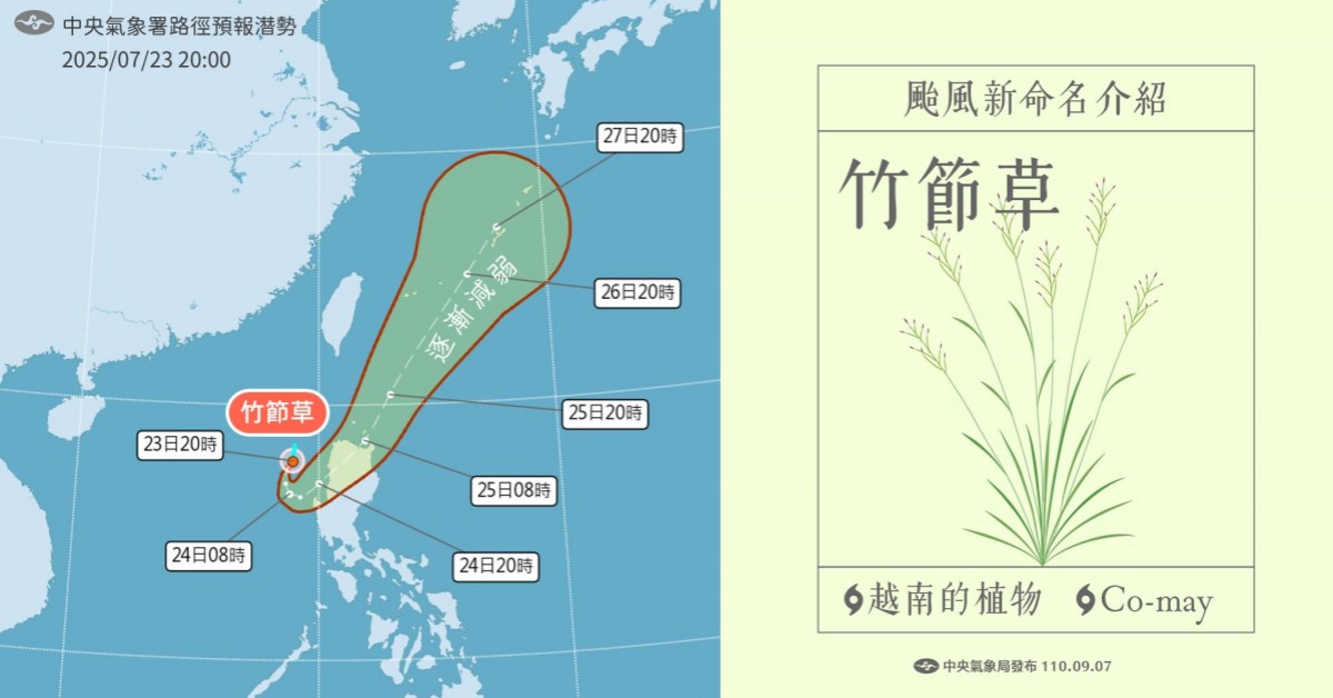 氣象署說明,當有颱風造成巨大傷亡或損失時,就會被「除名」,再由新的名稱遞補,這次首次與大家見面的「竹節草」,就是2021年新遞補的名稱,取代了2019年造成嚴重影響而被除名的「利奇馬」颱風。