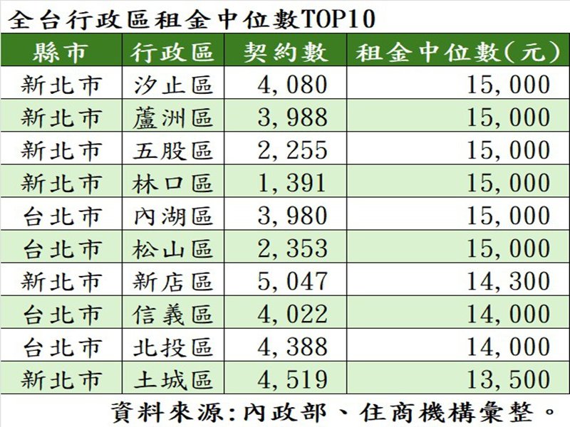根據內政部數據,全台各行政區若不分房屋類型,租金中位數排行前25名都位處雙北,其中新北市汐止、蘆洲、五股、林口、台北市內湖及松山等區租金中位數皆達1.5萬元,並列全台最高,之後依序為新北市新店區1.43萬元、台北市信義區1.4萬元、台北市北投區1.4萬元以及新北市土城區1.35萬元。