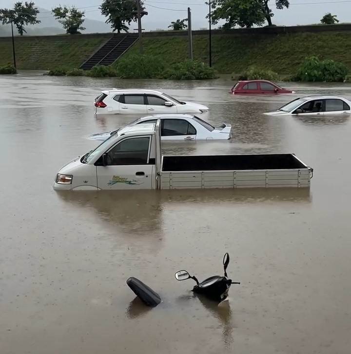 南投縣南投市一間駕訓班昨日下午淹水嚴重,十幾台車輛全都泡水(圖/翻攝自Threads@52dd_0202)