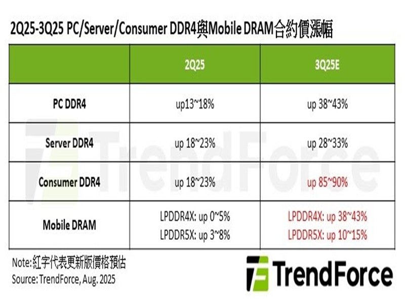 目前廣大的中低階智慧手機仍主要使用LPDDR4X,隨著美、韓系原廠將於2025至2026年間減少或停止供應LPDDR4X,市場恐慌情緒蔓延,加乘供應商間的競價,使得第三季LPDDR4X合約價漲幅隨之擴大,TrendForce據此上修第三季價格至季增38%~43%。