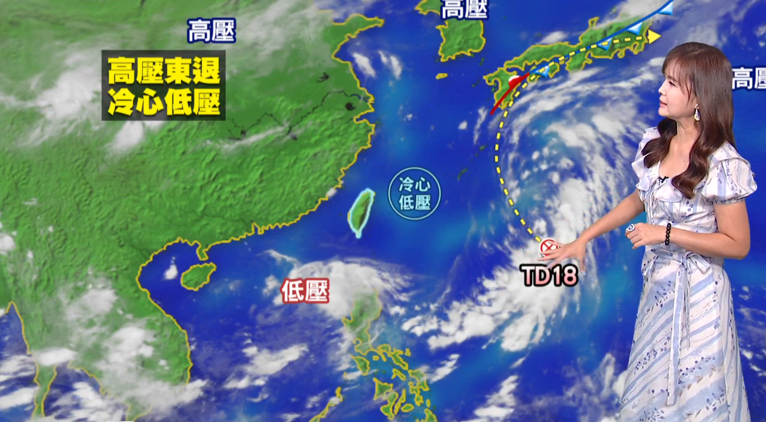 氣象主播王淑麗表示,目前在台灣東方約1000公里的熱帶性低氣壓TD18,持續往日本的方向移動,預計今晚成為第15號颱風琵琶,對台灣的天氣不會產生直接影響,但是在台灣東北方海面的冷心低壓正朝台灣移動,預計今天午後對台灣各地造成影響。