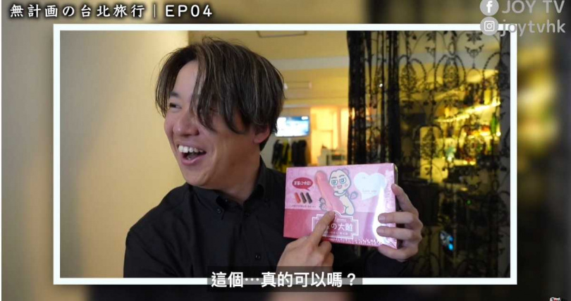 外籍Youtuber在西門町拍片時,被業者放在馬路旁的廣告看板吸引。(圖/翻攝YT/JOY TV)