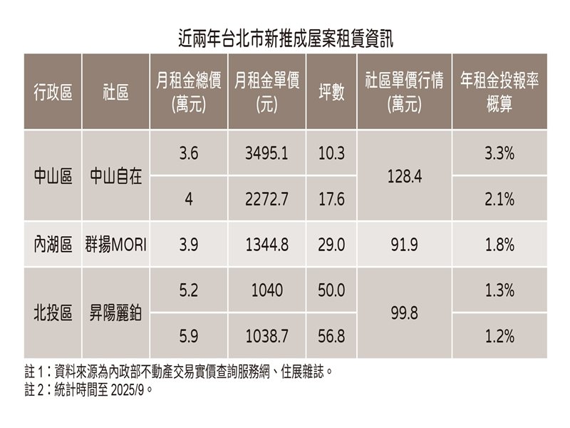 值得注意的是,陳炳辰分析,台北市新成屋的高房價一定程度稀釋了出租投報率,比方說此次統計的「中山自在」雖有租賃優勢,平均每坪128.4萬元的交易價碼,要是僅租到單坪兩千多元則只有2%的投報率,追趕不上走高的房貸利率。當前購置小宅新案也較訴求未來轉手賺價差,如台北市就多有新成屋持有一兩年出售獲利數百萬元。