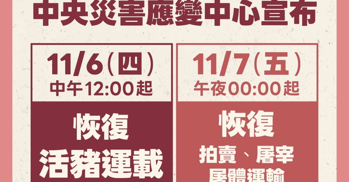農委會於10月22日召開記者會宣布台中爆發非洲豬瘟,隨後又陸續祭出全國禁宰豬隻15天等禁令。中央災害應變中心表示,11月6日12點起,開放活豬運輸,7日凌晨12點開始,也開放批發拍賣屠宰,也就是說最快週五就可子吃到溫體豬。